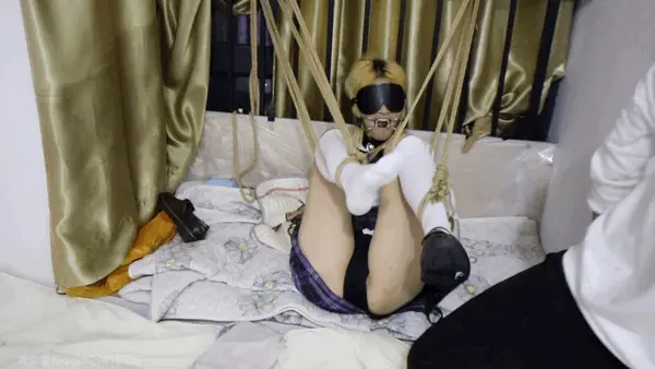 欣欣感觉到痛了直接开始剧烈的晃动双脚可是只能无助的悬吊着由于嘴巴带着口枷也只能发出呜呜呜的无助声音