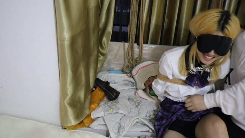 废话不多说,上身绑好欣欣后直接扔到窗户旁边的铁栏杆上,小姐姐还不知道接下来会发生什么,还在甜甜的笑呢