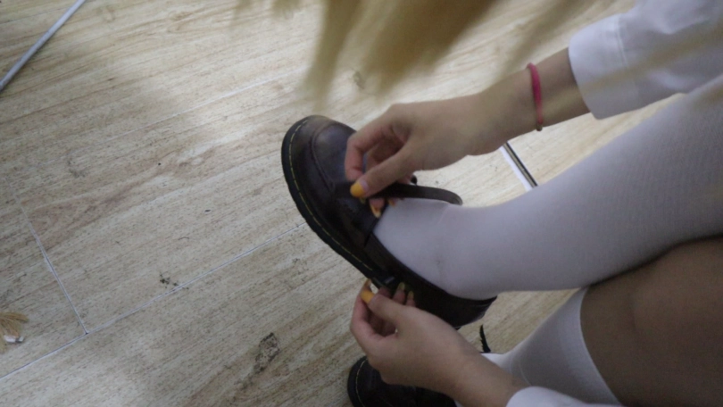 一开始是欣欣穿白棉袜子换鞋子的小特写,在换鞋子这里就开始欺负她了,jk为正版电竞少女,欣欣本来是个非常高冷的女孩子,但在调教的时候还是很活泼的加入了gif图