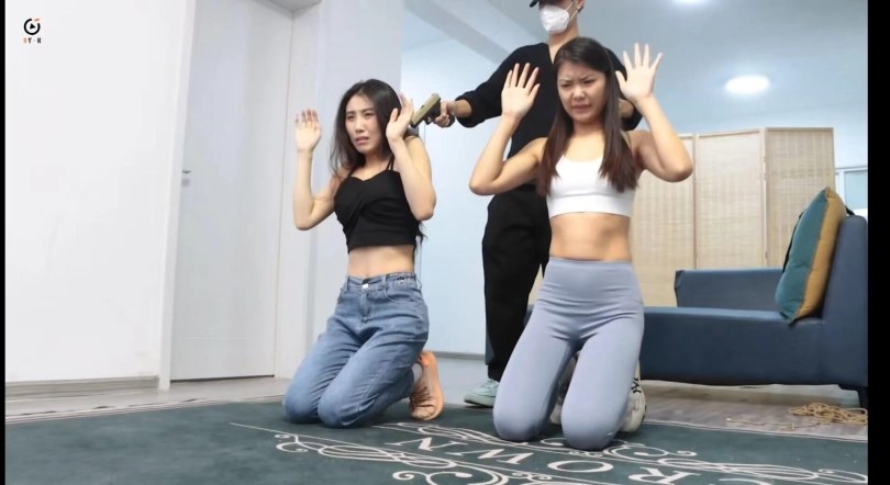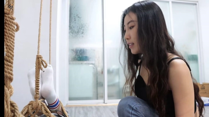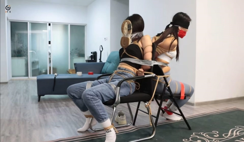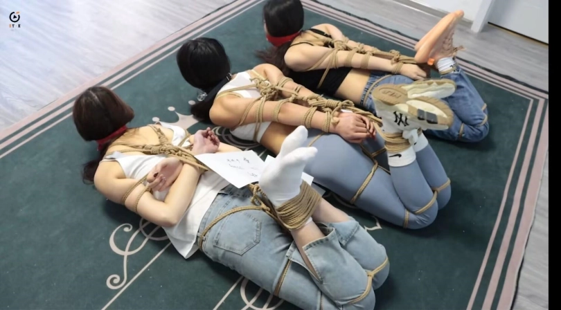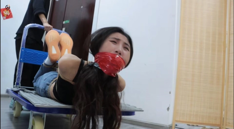 玩弄二女累了的小妤去睡觉了,过了一会,不老实的恩可和雨辰开始挣扎并解着自己身上的绳子,但这不是一件容易的事情,二女挣扎扭动了好一会,恩可率先解开了绳子,接着开始帮雨辰解开绳子,接着解嘴巴,撕胶带,挣脱了束缚的二女,都打算好好报复一下小妤,于是拿着绳子来到卧室,二女配合,一个摁住小妤,一个对她捆绑,经过一顿的挣扎,小妤不敌二女被五花大绑,手脚被结结实实的捆绑起来,接着雨辰捏住小妤脸颊和鼻子逼迫她长大嘴巴,恩可则将一个口球塞入小妤嘴里,让她无法大声喊叫。捆绑堵嘴完小妤后,二女将她抬到客厅,打算将她吊起来玩弄一番!镜头一转,小妤被屈辱的捆绑并悬空吊在客厅,任由恩可和雨辰对她玩弄却无可奈何!接下来,二女玩一女,TK,摸胸,闻鞋都有,场面香艳就不过多赘述了,请大家欣赏视频。玩弄结束,二女打算报警然后离开这个是非之地,可是一打开门,狼哥双手持枪站在她俩面前,二女懵了,但不等他们反应,狼哥将二女押进客厅,命令其跪下,随后镜头一转。三女被驷马倒攒蹄同框场面来了,狼哥给她们三个带上牌子,上面分别写上三女的姓名,身高三维,然后拍下视频将要出售,二女只能惊恐呜呜呜挣扎。一会,狼哥推着板车来了,先把恩可装上板车然后运走,其次是雨辰,接着是小妤,三女就这样像货物一样装上板车运走,迎接不一样的命运了。故事结束,片尾有采访。