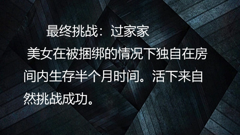 第4集一开始美女还比较大意,但没想到被奇怪的绳子紧缚越挣扎反而越紧,没一会就被全身捆绑了,工作人员还将她口球堵嘴最后胶带封死,手部用胶带握拳包裹,双腿用丝袜单筒包裹,最后才宣布美女的最终挑战,她居然要在被捆绑的情况下生活15天,就在美女大喊大叫的抗议中挑战开始了,美女经过几个小时挣脱挣脱了一些拘束但没一会绳子又自动收紧恢复了捆绑。美女根本无法挣脱只能勉强在房子里吃东西喝水,最后受不了失禁了。。。