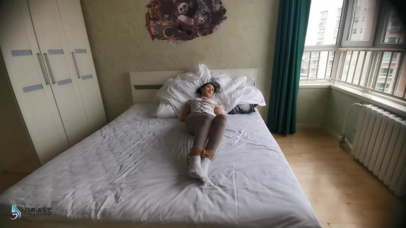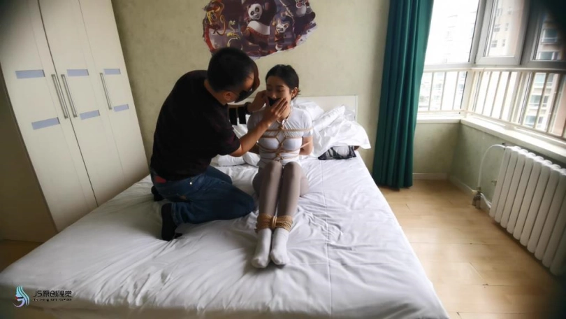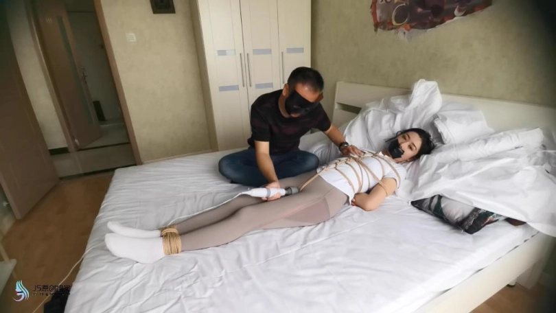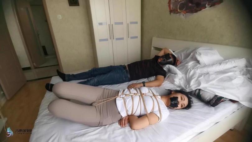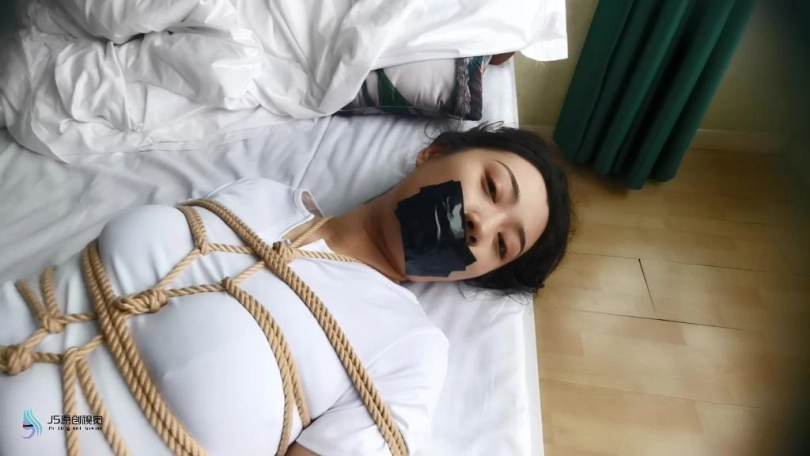 艾可被龟甲捆绑起来,嘴巴用胶带封堵。用快乐棒刺激她的下面,搂着大美女睡觉。艾可在身边被刺激的不断呻吟。接下将跳D放在她的内衣里刺激她的胸部,在固定在下面刺激。