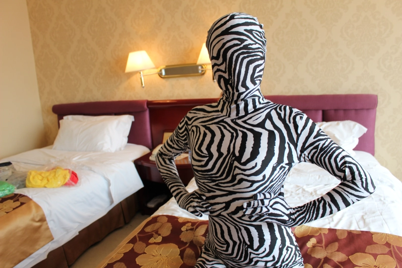 Susan妹子穿着透亮的肉色zentai打底,分别换上了斑马纹,黑色镂空和亮黄色的紧身衣。