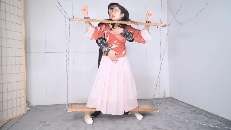 这套古装好似有魔力一般,沐小雨穿上就像戏精附体,表演欲爆棚,我这老演员都差点没接住,微剧情有点意思,不做过多介绍。单说这木枷组合,头一次用铁链连接吊起,固定作用明显,还有足够活动空间,据说古代犯人带着木枷时间过长,能够被活活卡死,我不太相信!于是顺着她的剧情,把沐小雨和木枷一起解下来,还真让她找到了求生姿势,就不知道如果戴着我这套厚重木枷能坚持多久了。