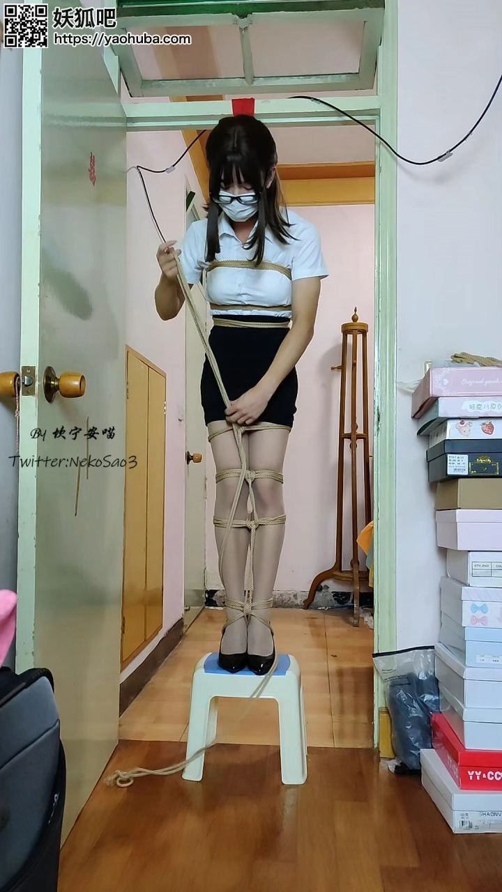 然后还穿上了12cm的高跟,并腿之后把鞋子也固定在脚上~