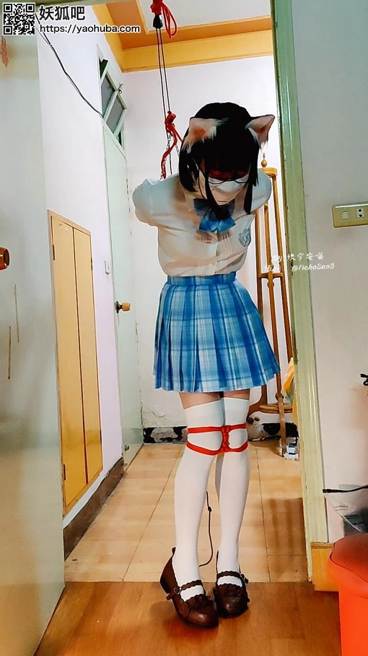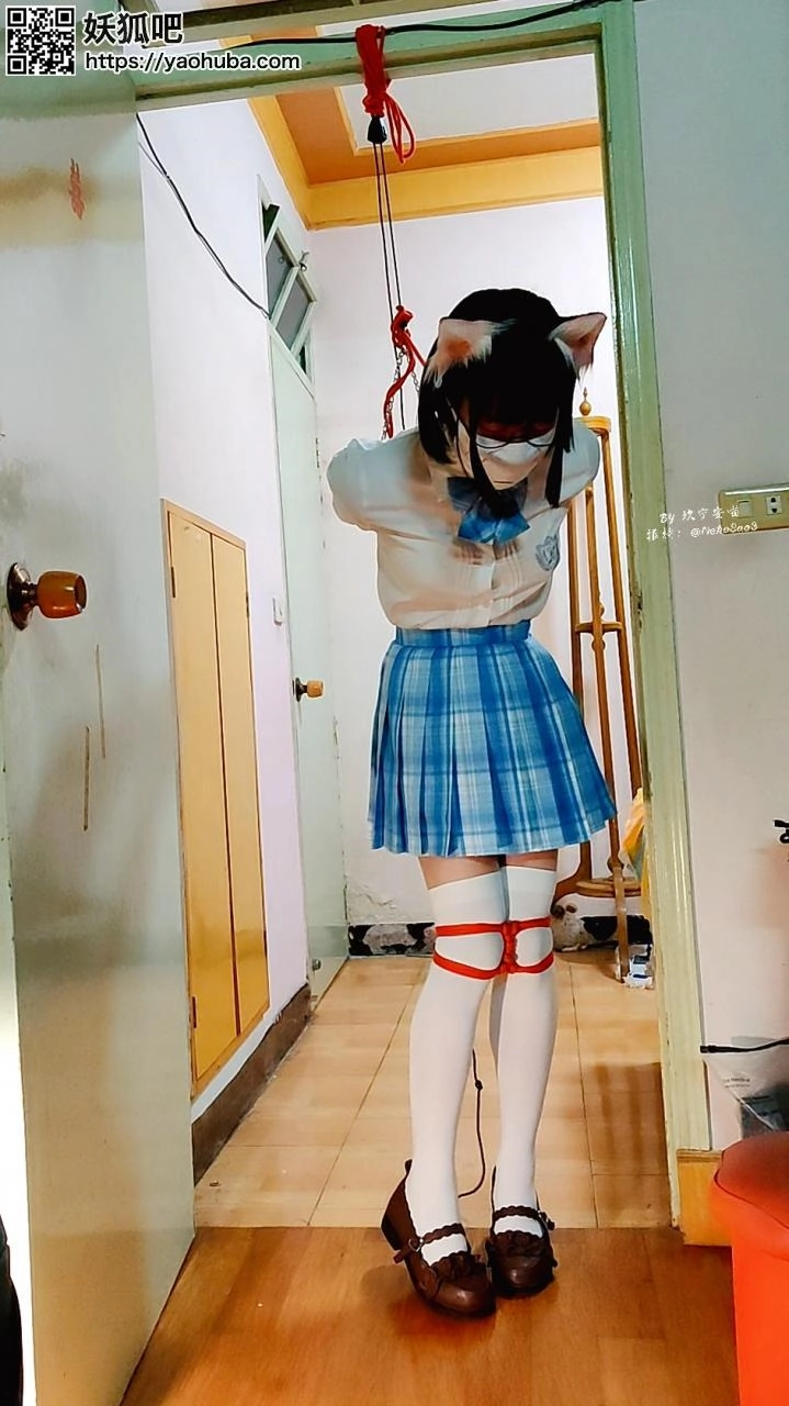 依旧是传统艺能自缚吊缚,这回尝试了下后手直臂,将手铐挂在收紧器上,同时用绳子做一个收紧绳[不可描述]在手肘上,先穿过项圈上的环,再固定到收紧器上,这样只要收紧器向上收紧,手套就会把手肘向上方收紧,就会难以解开(也为之后留下了伏笔orz)~