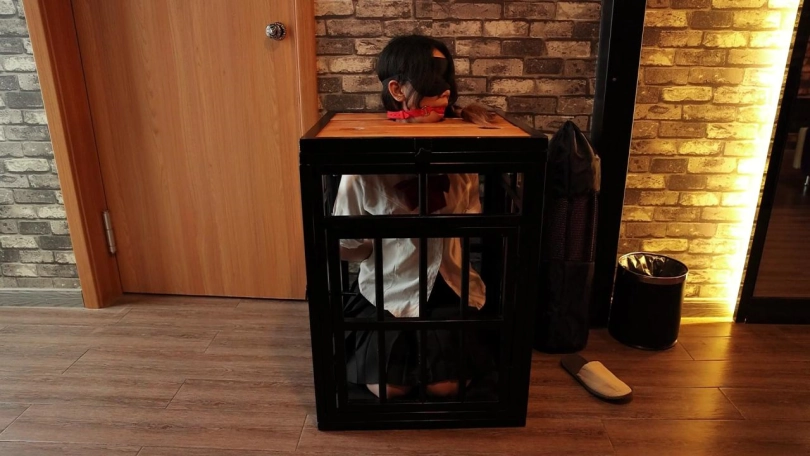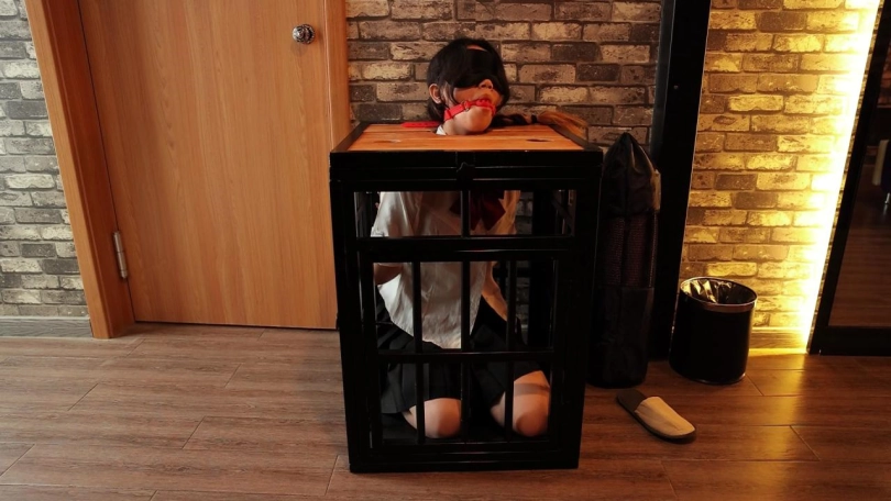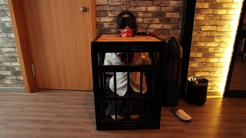 这是在SM主题酒店的第二弹,我再去之前卖了几个道具发到附近的菜鸟驿站,所以就去取快递了。但是当然又不希望CC这么轻松的躺在大床上享受空调,我却顶着大太阳呀。所以就把她双手反绑装载了一个小小的囚笼里面,里面空间超级小,CC跪坐在里面只能把全身重量全压在腿上蜷成一团才能勉强放进去,在面上用模板拘束头部,堵上嘴巴,一个完美的美人痰盂就做好了哈哈。然后我就出去取快递去了,房间里空无一人,CC再难受也只能无助挣扎,最后几分钟已经可以很明显看出CC已经坚持不住了。