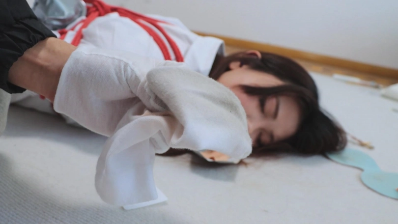 被激怒的歹徒脱掉她的袜子搭在足枷上,然后把她脚趾逐个绑好,缓慢地给脚底涂上精油,包括每一根脚趾都涂上精油,凶狠的说道:这种精油会让你的脚底变得更加敏感,让我看看你的这双大脚丫子是不是跟你的嘴一样硬!