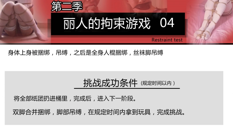 之前也做过同系列的,这次也发一部新的,丽人的拘束游戏主打的就是真实系游戏,很明显灵感来自日本的紧缚实验,只是玩法更多,希望大家喜欢。