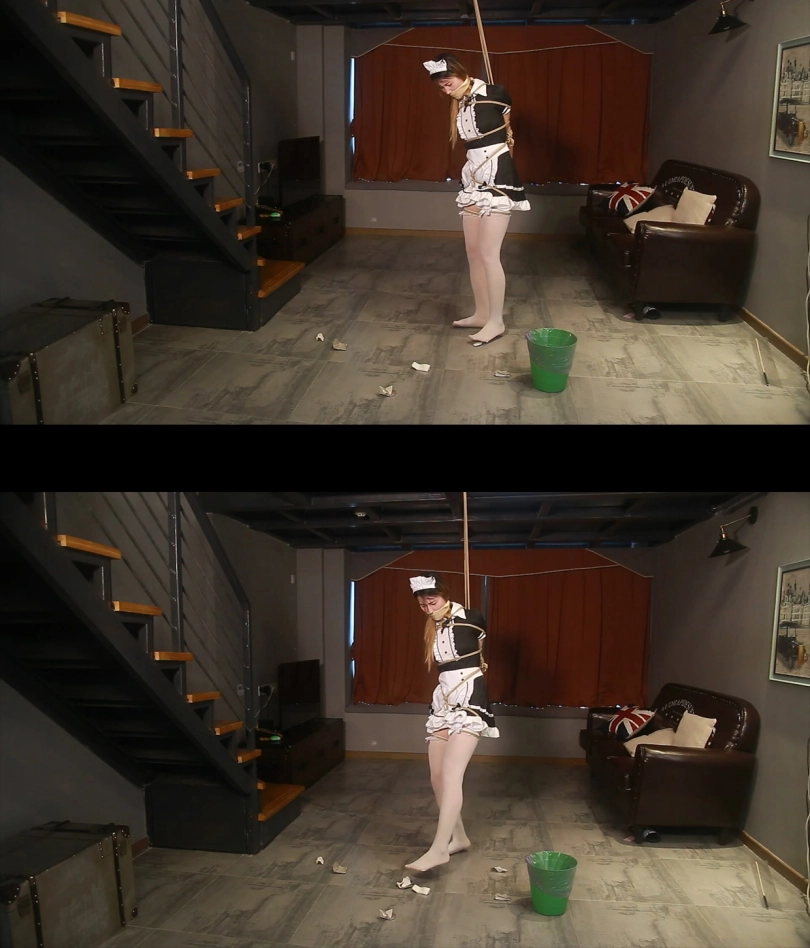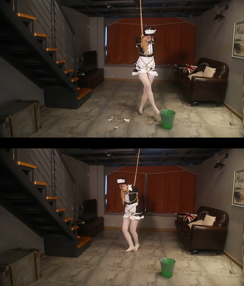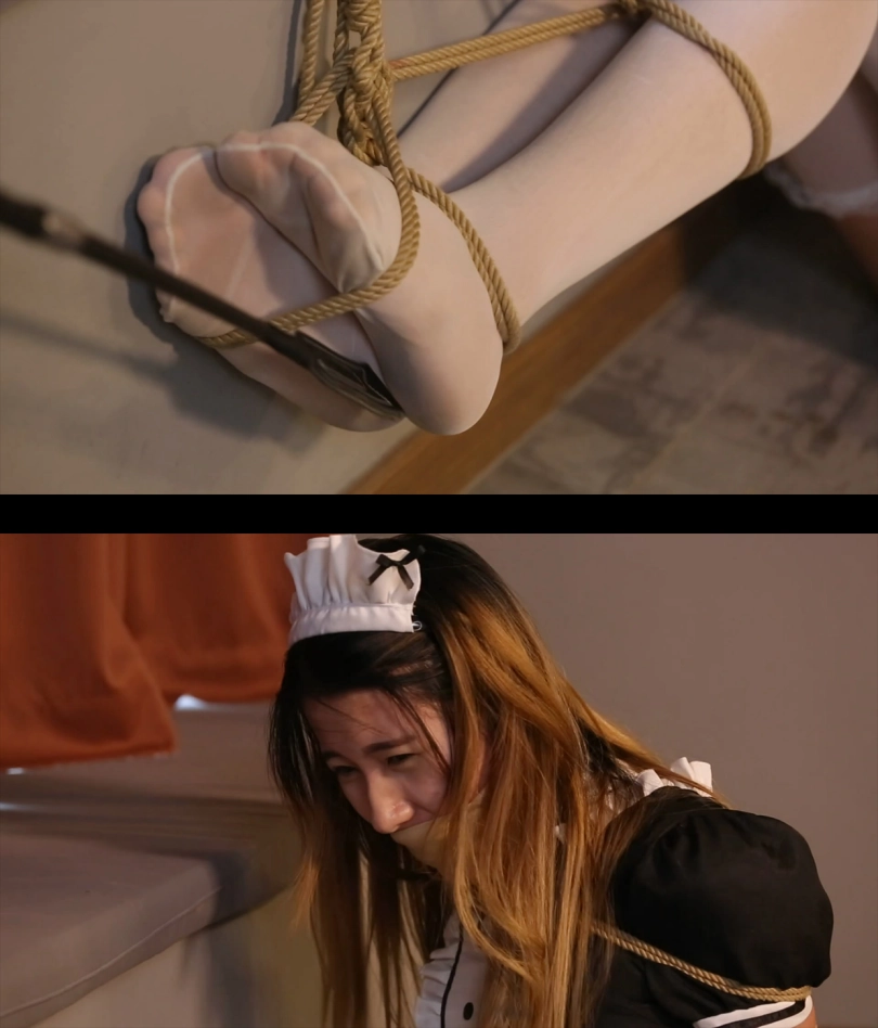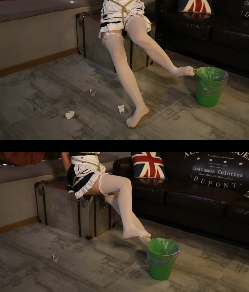游戏正式开始,穿着女仆装的美女上半身被完全捆绑,只有白丝美脚是自由的。