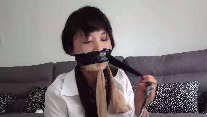 (八)遭到入室歹徒袭击捆绑塞嘴折磨的美女林丹丹经过不懈努力总算挣脱束缚,弄掉封眼绷带胶带后慢慢撕掉嘴外自粘绷带与胶带,拽出口中自己穿了好几天没洗的一条脏肉色连裤丝袜大口喘气,咒骂着可恶的劫匪。