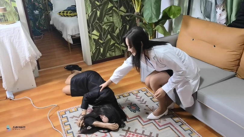 我们看到沐兮走向哈尼的办公室,走上楼梯时露出了双腿。她走进哈尼正在等待的房间,哈尼欢迎她并请她坐下。沐兮解释了她最近的睡眠问题,并问哈尼她能做些什么。哈尼建议进行一次训练,让她在触发器被激活时进入深度放松睡眠。沐兮同意。哈尼让沐兮喝了一杯准备好的茶。然后陪她走到另一个地方的沙发上。木希问哈妮触发了什么,但哈妮告诉她还不知道。哈妮说秘密物体就在桌子抽屉里。沐兮开始觉得头晕,哈妮告诉她茶被下药了。她很快就会昏倒,沐兮很惊讶,提出抗议,但哈妮告诉她从抽屉里拿东西,离开房间,沐兮站了起来,但跌跌撞撞,感觉到了药物的作用。她努力保持清醒,但很快便跌倒在地。她试图爬到抽屉前,但屈服了,昏了过去,鞋子在这个过程中掉了下来。哈尼抱起她,把她带回沙发上。哈尼走到抽屉前,打开抽屉。她拿出一个红色的球塞。她把它放在仍然昏迷的沐兮身上。哈尼轻轻地按摩和抚摸着沐兮,沐兮开始在睡梦中做梦和搅拌,有时会发出一声快乐的叹息。