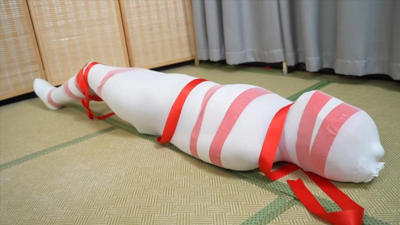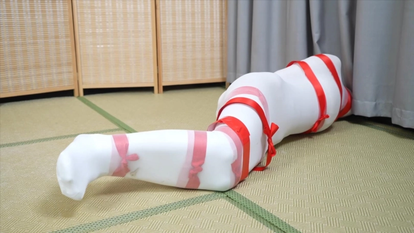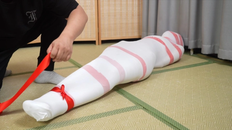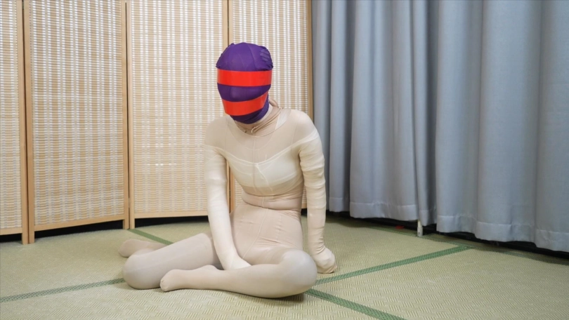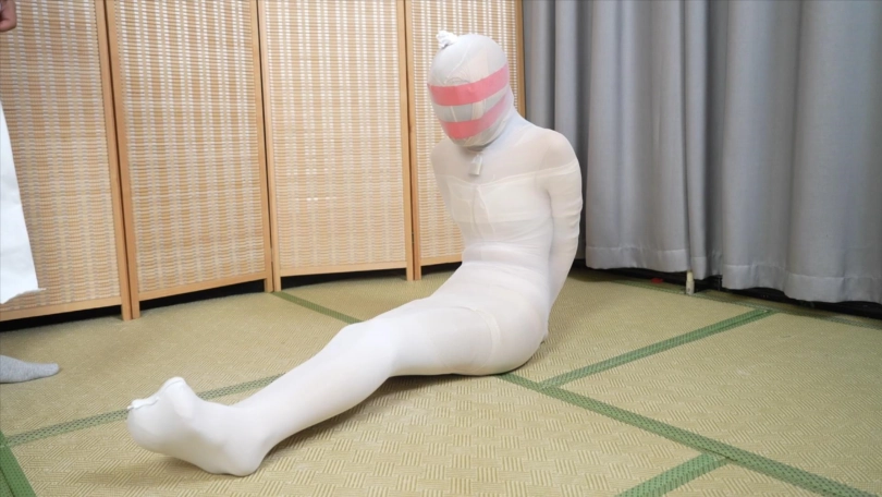 头上套多层连裤袜,戴上项圈并上锁,把两条腿包进一条长筒袜里