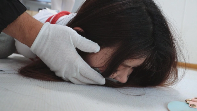 摩尔先生来到警戒线之前,戴好白手套,弯腰越过警戒线进入现场,首先勘验现场的shi体,摩尔先生用手首先细致观察了封嘴方式,感受僵硬程度,再拉拽连接手脚的绳子,经过仔细的勘察发现了更多的细节,例如:摘掉眼罩,按压shi体嘴部胶带发现嘴里塞着柔软的布类物品,撩开耳边的头发发现耳部塞着耳塞,按压套着袜子的手感受到里面被胶带缠绕,脱掉手上的袜子后仔细观察被胶带缠绕的手,观察被绑住的大脚趾等。