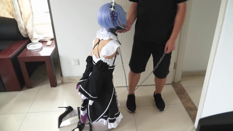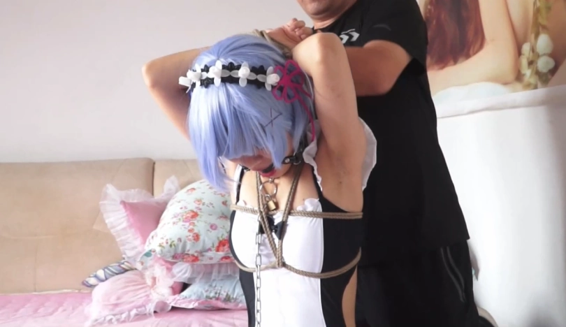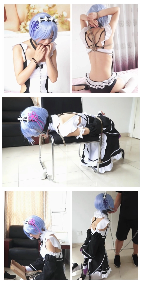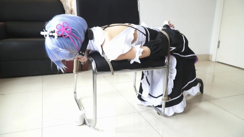蕾姆跪在地上,绳子将她牢牢地固定成趴在椅子上的姿势。这个开口的口枷真是个有意思的玩意~看着蕾姆口水直流的模样,我整个人都入迷了~