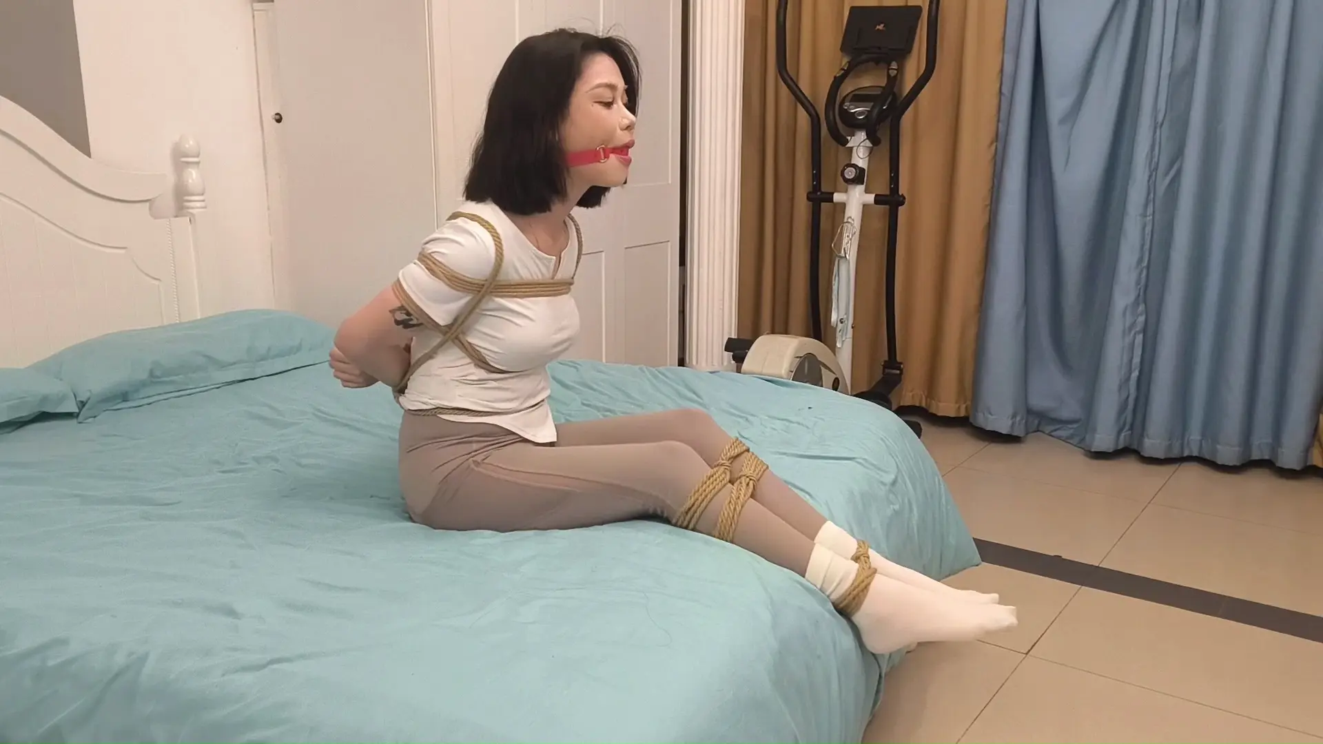› 【美束映画】短发美女白袜瑜伽裤捆绑海老缚挣扎