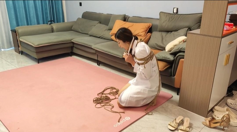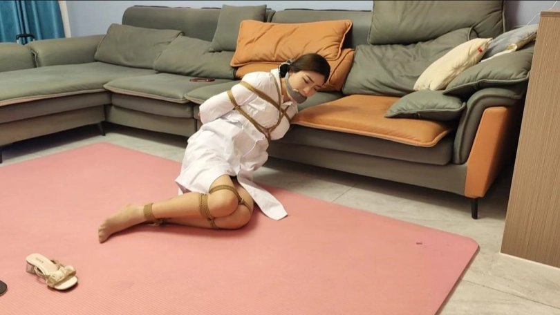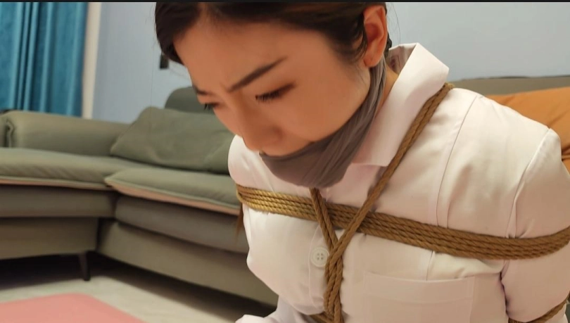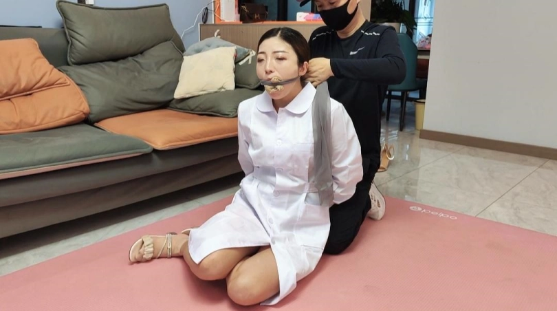 护士回家,被歹徒劫持,捆绑,丝袜嘟嘴,经过挣扎逃跑,被歹徒发现,二次捆绑,用布堵嘴,再用布条勒上,歹徒拿到财务扬长而去,剩下护士苦苦挣扎,自己挣脱开,本次视频亮点是堵嘴,后面又花絮,直接堵的模特干呕,非常真实,二是,最后一幕真实护士自己挣脱开逃跑