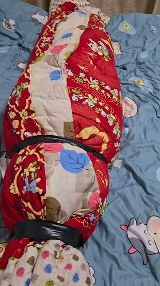 查看完整版本: 【小黑】四层棉被+床单,棉被包裹木乃伊,棉被全包细小呼吸管,呼吸不过来,大夏天太闷热了。