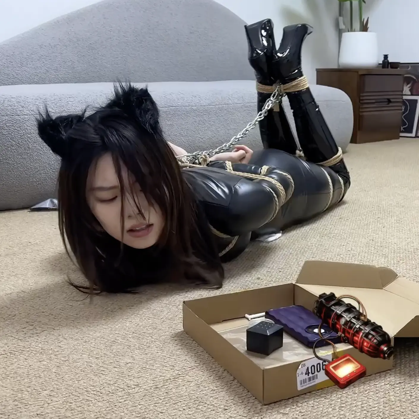 出镜的是拥有超模身材的新人盖盖!经典的特工did剧情,黑色皮衣皮靴的美丽猫女在黑暗中打开了一个神秘盒子,里面不是财宝而是白雾和定时炸弹!猫女挣扎着倒地,黑衣男子立刻拎着绳索扑了上去