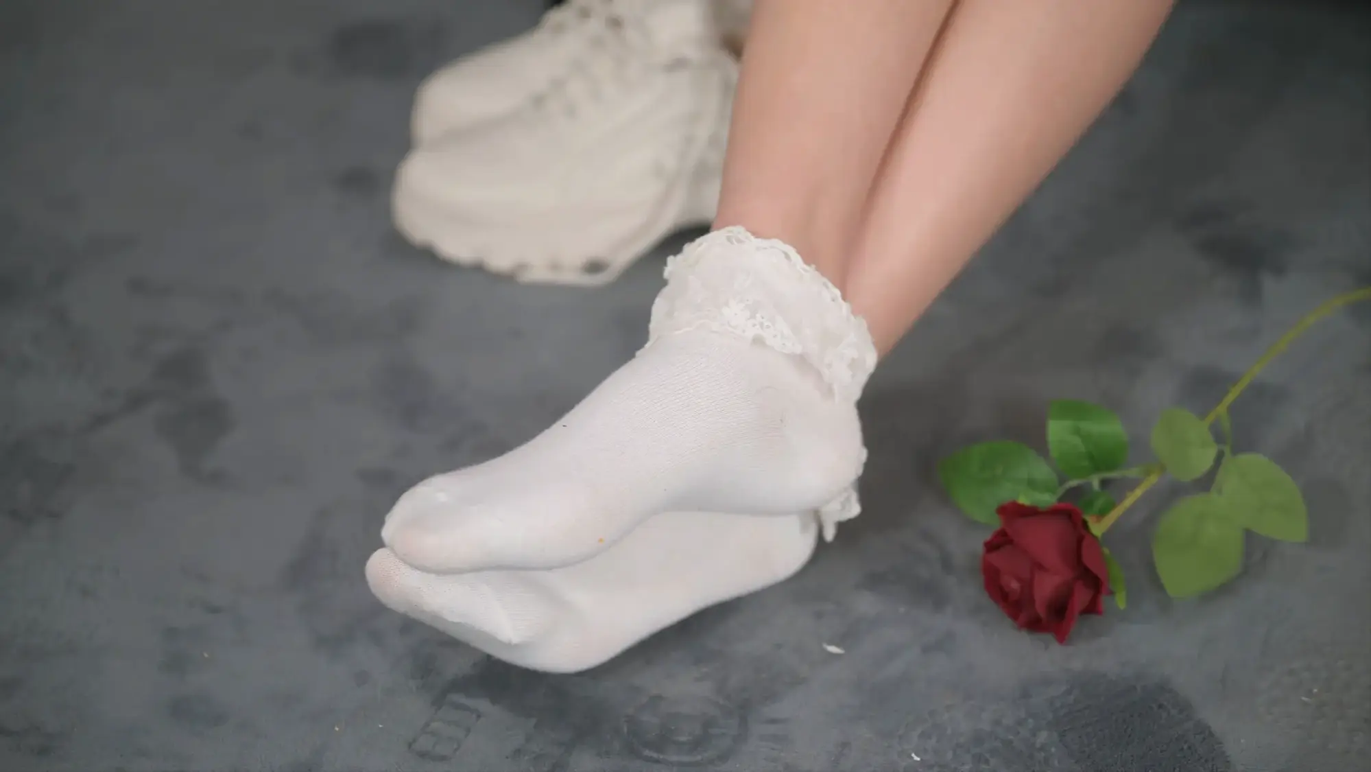 › 【撒琅制造】【美腿玉足系列】高挑足球短裙玫瑰配花边棉袜运动鞋加裸足--(无捆绑)