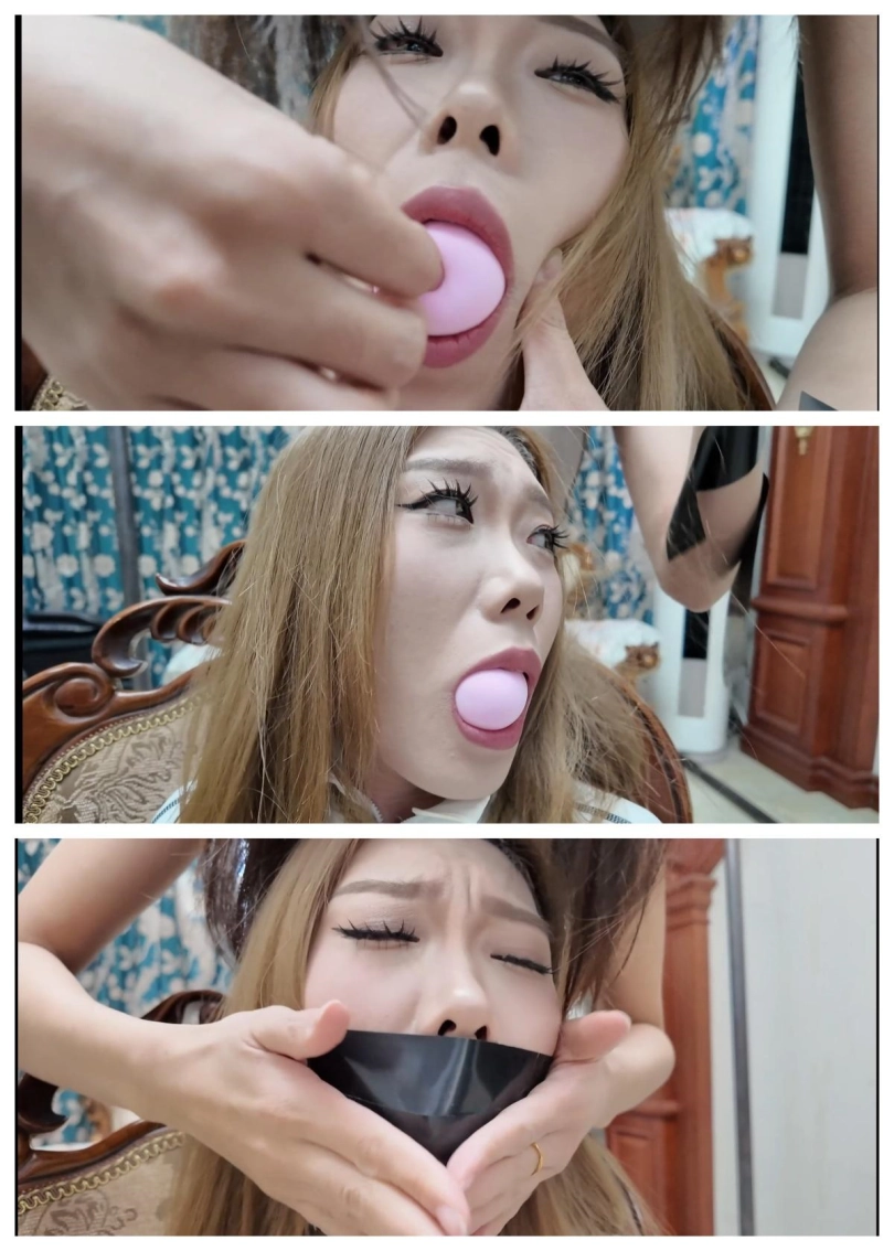 镜头一转,来到了坏蛋的巢穴,此时柠琪将芷溪押着走进房间,可就在过道都可以听到雨诺呜呜呜呜的声音(此时的雨诺正被驷马倒攒蹄捆绑在椅子上被坏蛋挠痒痒难受得很),救人心切的柠琪推着芷溪说到:赶紧走了,别让我队友受苦!芷溪走得踉跄发出呜呜呜的抱怨!就这样二人来到关押雨诺的房间,看到柠琪绑着芷溪进来,两坏蛋一下子就停下玩弄雨诺,对着柠琪说到:你还真敢来呀?柠琪说到:少废话,快放了我队友!眼镜坏蛋说到:慢着,你说绑来就绑来呀?我怎么确定是不是那个小贱人的女儿?给我们验验货!口罩坏蛋说到:让她跪下,口罩摘了,眼镜取了,我们验验货!为了队友,柠琪只好命令芷溪跪下,然后摘了她的眼镜,摘了她的口罩!让口罩坏蛋近距离的欣赏芷溪的脸,口罩坏蛋看了看芷溪的脸还摸了摸后,对眼镜坏蛋说到:这还真是那个小贱人的女儿!眼镜坏蛋听后,上来亲自查验,也确认是芷溪后满意点头!随后柠琪说到:人给你们绑来,人你们也验了,快放了我队友!眼镜坏蛋露出坏笑说到:既然来了,就不要走了嘛!兄弟把她拿下!接着二人一拥而上,柠琪转身推门想跑,可已经来不及了,被二坏蛋摁倒在地上,随后二人拿来绳子,欲将柠琪捆绑起来,柠琪已被压制了无力反抗,只能被二坏蛋捆绑!镜头一转,柠琪和雨诺被五花大绑蟹缚捆绑在椅子上,然后眼镜坏蛋拿出一块厚厚的毛巾,用手将柠琪嘴巴捏开,随后将厚白毛巾塞入了柠琪嘴巴里,接着用五张黑色胶带粘住了柠琪的嘴巴,剥夺了她说话叫喊的权力,柠琪只得呜呜呜在椅子上挣扎!捆绑堵嘴完两个女保镖后,二坏蛋又将一肚子坏水对准了芷溪,二人撕开了芷溪嘴巴上的胶带,然后取出了塞着她嘴巴的化妆棉,可别以为这是坏蛋发发善心想给芷溪舒服,刚解开芷溪的嘴巴,口罩坏蛋就拿来了柠檬和粉色口球,二人合力将柠檬塞入了芷溪嘴巴里,然后用粉色口球堵住了芷溪嘴巴并在脑后系紧,确保芷溪只能边流口水边发出微弱的呜呜呜声!这样,三女都被捆绑结实,堵嘴完毕了,二坏蛋商量着如何玩弄二女,最后决定将芷溪驷马倒攒蹄捆绑在桌子上,然后雨诺绑在眼镜坏蛋旁边,柠琪绑在口罩坏蛋旁边,二坏蛋在芷溪身上玩“抽王八”的游戏,边“抽王八”边挠芷溪的脚心,腰,脖子等痒痒部位!然后谁赢了谁就可以惩罚输家旁边的女保镖!