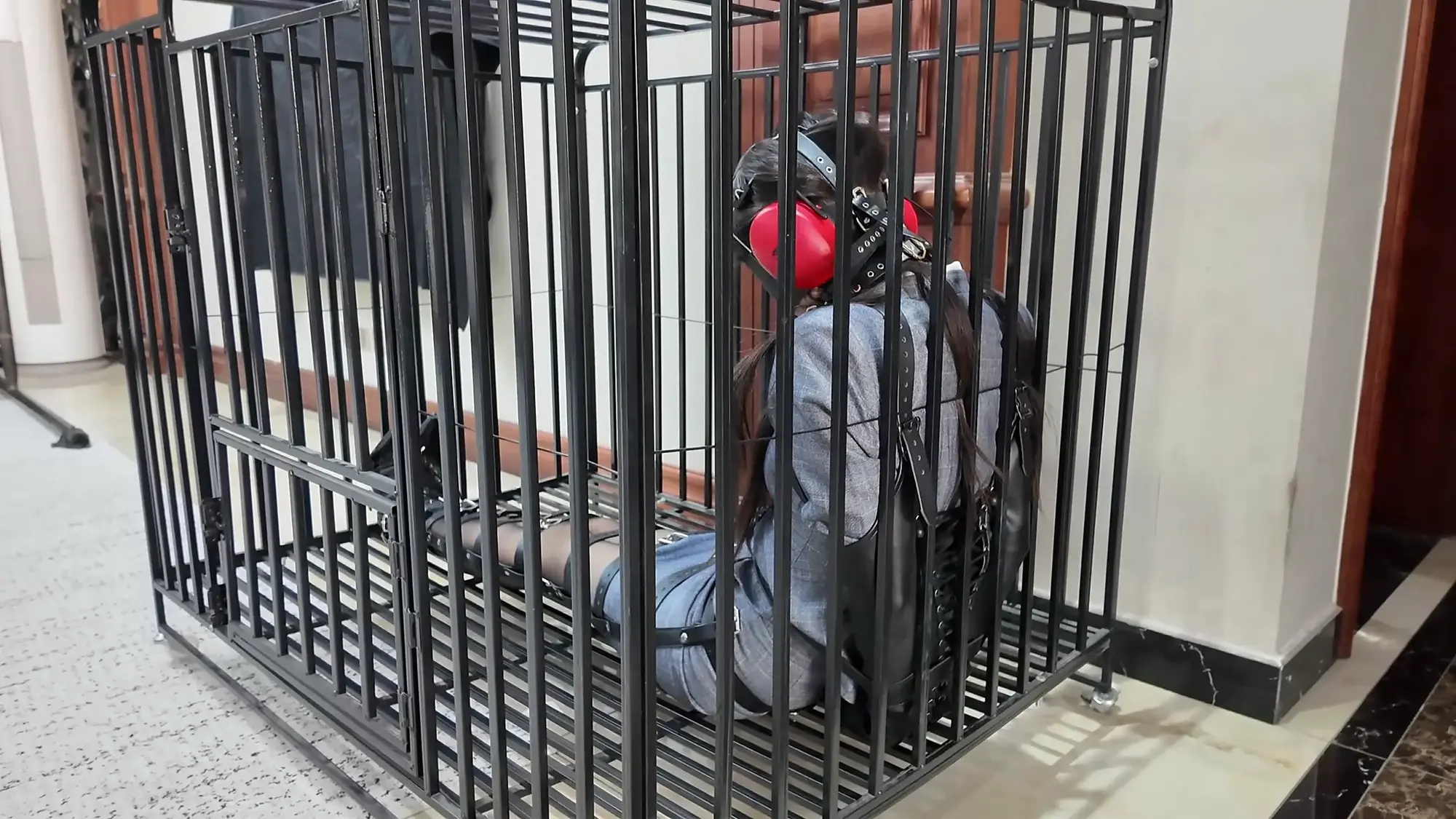 上去了之后,老板说:请我们亲爱的卉萱小姐进去休息一下吧,并指了指面前的笼子,卉萱瞪大了眼,这哪是床,明明是软禁她的囚笼,但是可由不得她,老板给她的腿绑上了最严密的束腿装置。防止她逃跑,然后就粗暴的塞进笼子里。卉萱靠在冰冷的金属栏杆上,试图撞开笼子,金属发出轻微的声响,但是门锁非常牢固,同时眼睛看不见,耳朵也听不见,只能不停的发出呜呜呜的声音,希望有人救她依旧是皮带,类拘束衣束缚,这次的捆绑方式应该是很少见的,却可以出色的完成,可见其实力