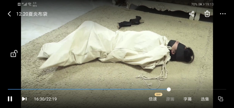 夏炎回家被蓄谋已久的绑匪劫持,迷晕后脱下短靴,丝袜塞嘴,龟甲缚,激烈挣扎后装入布袋,夏炎挣脱想要逃跑被绑匪抓回后封嘴蒙眼,装入袋中,最后带走,全程挣扎很激烈很刺激,简单剧情有代入感。