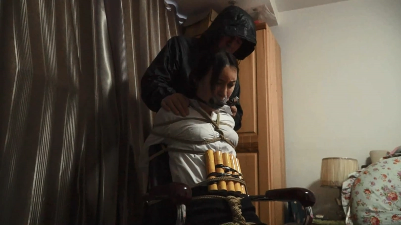 女卧底被捆绑在椅子上绑上爆单,被用枪顶住脑袋,门外传来队长的声音,队长打开门一边说道:“小刘,我们来救你了,你别怕”