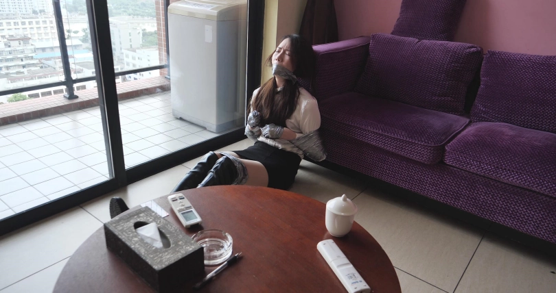 肩膀,双腿也是从膝盖处被折叠捆绑到屁股位置。脸上被胶带封的严严实实的,