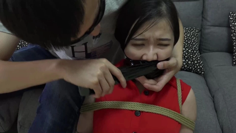 小雨艰难挣扎,却碰上返回的男友,将其更加严厉捆绑起来,并被男友拿小雨自己穿过没洗的一条紫色原味内裤塞入口中,用胶布绷带多圈缠绕封死。
