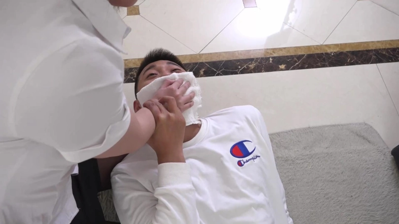 孙甜脱掉阿桃脚上的鞋和穿的一双白棉袜,取下阿桃男友口中的口球,把这双原味棉袜塞入他口中,塞得满满的,随即也用黑色宽胶布、黑色静电胶带、黑色弹力自粘绷带缠绕封死。