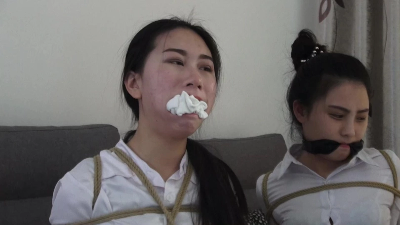 刘娜和孙甜姐妹二人被劫匪入室袭击,五花大绑坐在沙发上挣扎,劫匪又拿绳索将二人捆绑加固,分别拿一双棉袜和几双肉色短丝袜塞住刘娜和孙甜的嘴巴,塞得二人表情痛苦。