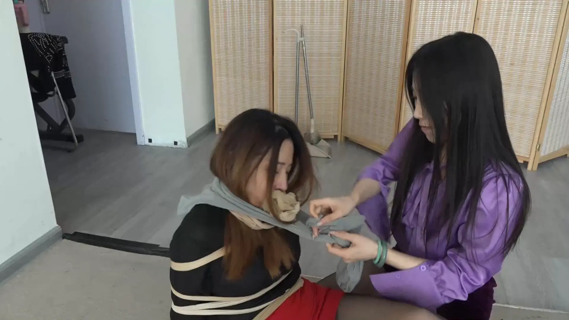 楼下美女被绑起来后,被逼着穿上性感的包臀裙、黑丝袜+高跟鞋