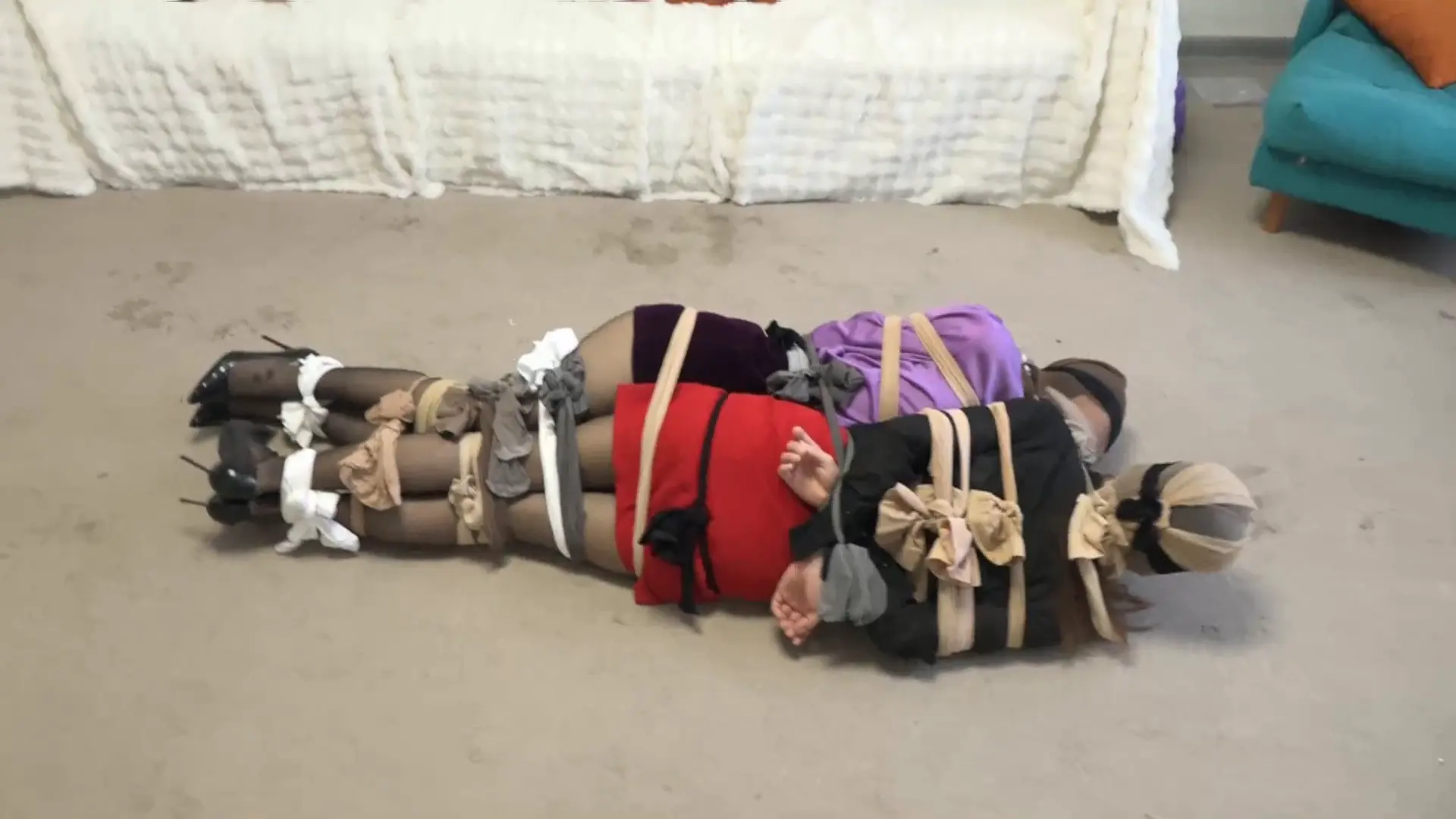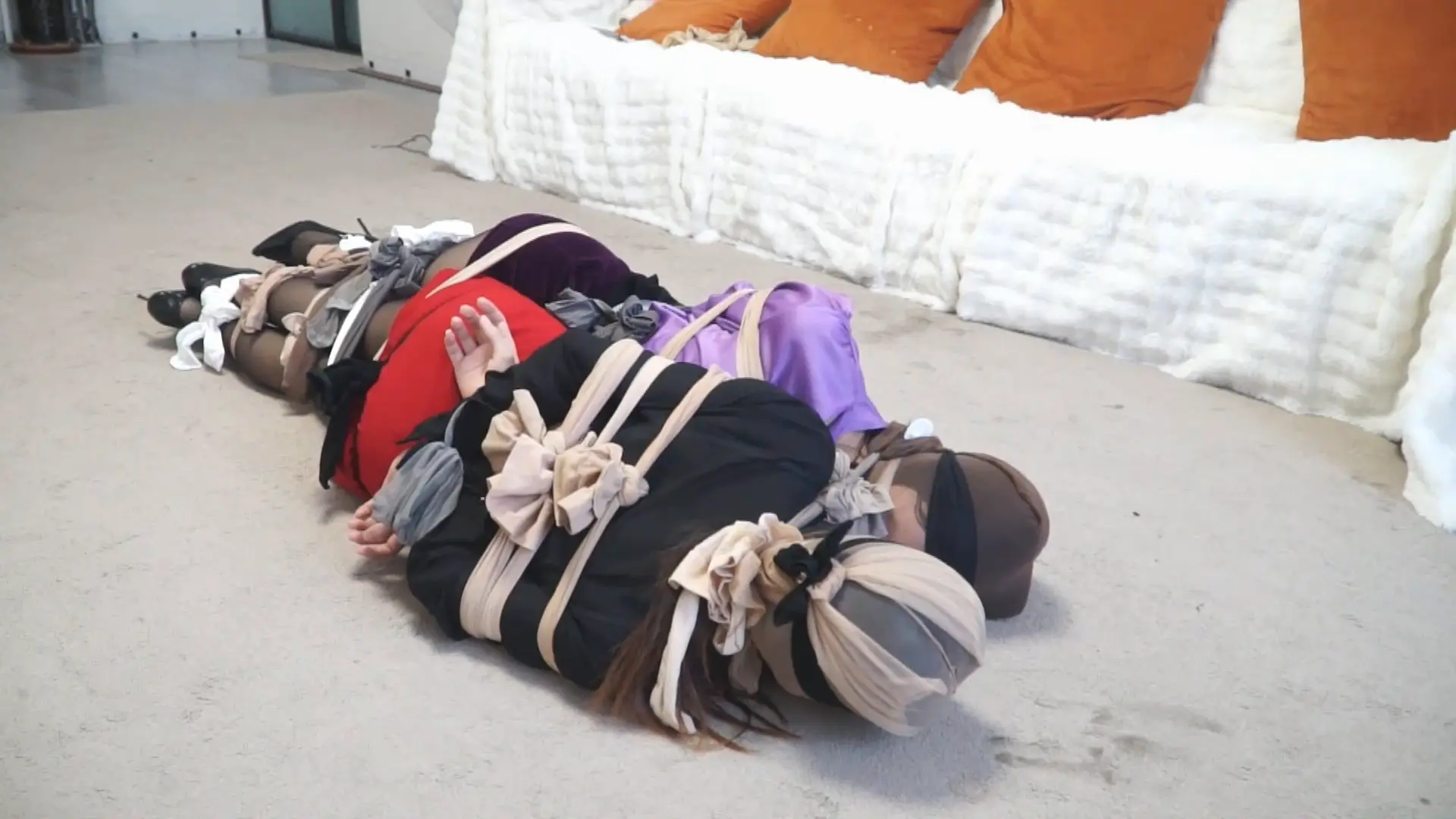 便将她们都用丝袜捆绑在了一起,并严肃地将头部都用丝袜蒙眼+全包起来。