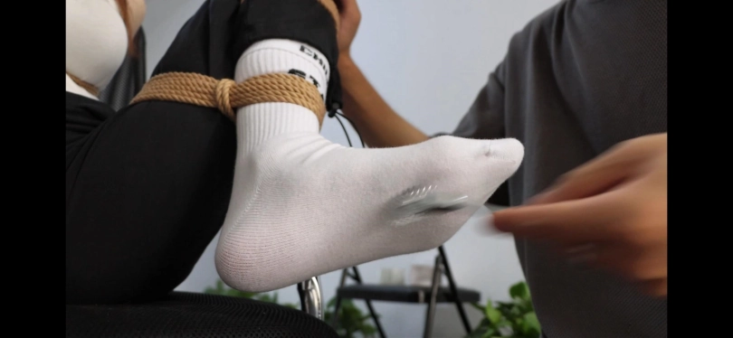第二幕,美女换了套衣服,运动背心,运动裤,长白棉袜加AJ鞋子被紧紧的蟹缚在椅子上,男子解开美女嘴上的胶带,掏出毛巾后又将一条丝巾塞到美女嘴巴里,把美女的樱桃小嘴都撑大了!而后用透明胶带封上。捆绑堵嘴完毕,男子给女主的胸部带上了电动按摩器,开大电击,给她胸部做个电疗按摩!美女被电得整个上半身跳动起来,还不快活!而这还没让男子爽快,他用美女快乐棒刺激着美女裆部,让美女上下都快乐!持续的刺激让电动按摩仪电量用完,而后男子脱了美女的AJ鞋子,一手美女快乐棒刺激裆部,一手拿齿轮给美女做脚步按摩,美女呜呜呜,男子还一手捂住她的嘴巴,一手抓胸部,极其快乐!