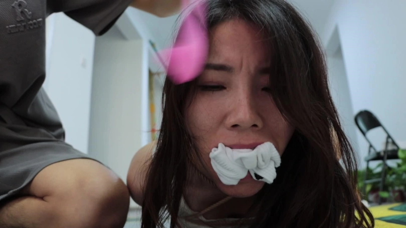 第三幕,玩累了被蟹缚的美女后,男子将美女结结实实的驷马倒攒蹄捆绑上,将一双厚白耐克棉袜塞入她的嘴巴里,用粉红色绷带缠绕住,接着用红色胶带缠绕封上,这样后美女连呜呜都小声了只能闷哼加上眼睛瞪人,确定美女被驷马捆绑结实又堵好嘴说不了话后,男子离开,留美女在地上挣扎呜呜呜。