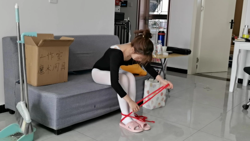 文文是一个芭蕾舞团的女成员,今天练习过后,她穿着一身运动型的打扮回家。她刚回到家后在门口收到一个不知名的包裹,上面写着「工作室魔术用具」,她把包裹放在沙发上。
