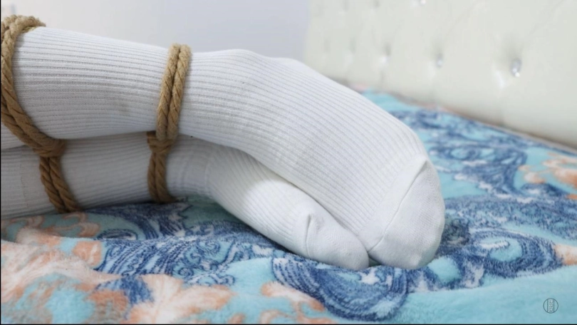 觉醒本性的许斌开始了对珊珊细嫩敏感脚底的TK折磨,被袜子蒙住双眼令珊珊对脚底的感触更加敏感,无论是隔着脏脏的白棉袜挠痒,还是脱掉袜子后用小刷子搔弄裸足,珊珊都只能在浑身拘束中忍耐着,甚至连脚趾都被扎带捆在一起,笑却笑不出声,只得用呜呜声去抗议。最终,被驷马放置的珊珊就这样度过了难忘的一晚。