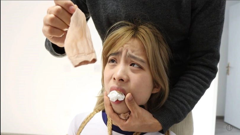 在股绳阵阵牵动下娇声连连,珊珊深知这样下去不是个办法,不打算坐以待毙的她开始了自己的逃亡之旅,窗户是隔音的,即便没有被堵嘴也无法呼救,放弃了呼救的珊珊艰难的蹦跳到客厅,即便身缚重重绳索,忍耐股绳摩擦,她也依旧努力的挪动到了门口,就在即将成功之际,许斌回来了。