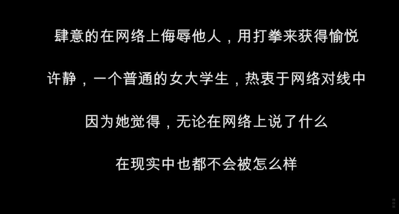 语毕,介绍剧情:某热衷于网络打拳的女大学生许静经常在网络上化身拳师,以嘲弄和侮辱男性为乐,她总是将普信男挂在嘴边,一边对网络中的人无差别的攻击,一边庆幸于有虚拟网络的保护而安然无恙。但是,哪里有压迫哪里就会有反抗,反抗就像一种意识,它无处不在。