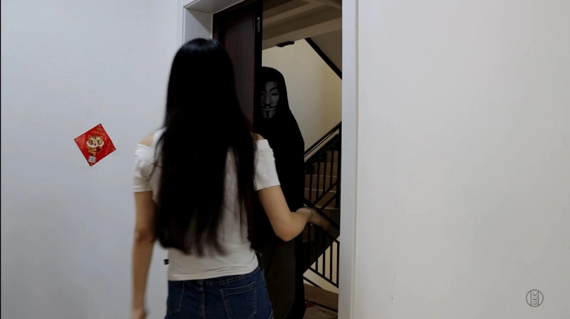 正要开门下楼的她在门口撞见了一个男人,男人带着V字仇杀队(思想是杀不死的)的面具,将她压制到墙边,还未等那句救命喊出声,男人的手掌便将她的嘴捂住,制裁的拳头悉数锤在她的腹部,令她切实感受到了现实的痛苦。