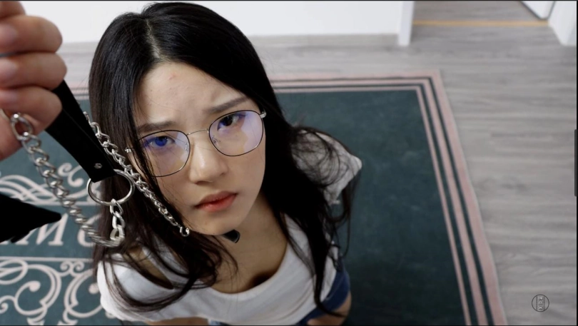 拉起许静项圈上的锁链,强迫她抬头仰望着自己,面具男代表的意志得到了满足,然而倔强的许静还活在幻想的世界中,她误以为自己还有选择的余地,却不知早已没有退路。