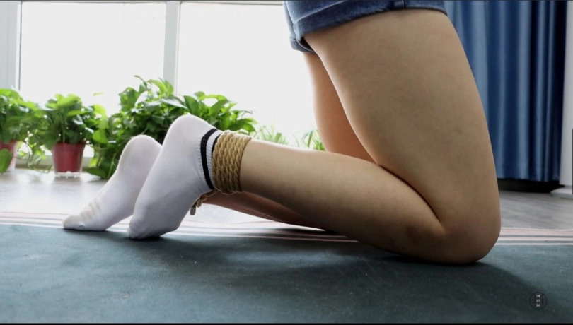 亮点:牛仔短裤,过膝白袜,四只船袜严密堵嘴,原味棉袜堵嘴,后手吊缚+拇指铐 项圈牵引,股绳牵引(跪姿爬行) 蒙眼堵嘴后跪缚+后手吊高放置