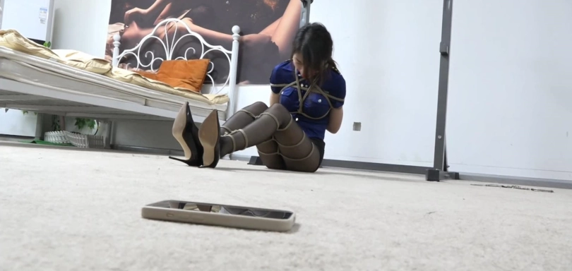 (值得一说的是因为我对于一些捆绑方式的话还是不太懂如何更有美感,如果对于一些捆绑方式有意见的可以留言,毕竟我知道的捆绑方式只有那几种,剧情嘛还是有蛮多的,所以希望大家能提一些宝贵的意见,不然以我对捆绑姿势的认知太少了,视频的话为了让大家都能看到是不会以太高的价格售出的,下面简单说一下剧情背景)刘小萌被紧紧捆绑起来,这个时候匪徒又进来了。匪徒还是不放心对她的捆绑,紧接着又拿来一根绳子为她解开腿上的脚铐。刘小萌戴着口球艰难的说出一句话:“你要干什么,我劝你还是尽快自首吧!”匪徒:“你给我老实点待着,不然我可不能保证你的安全。”解开脚铐之后扶着她站了起来,用着绳子在她的双腿来回缠绕,捆绑好之后刘小萌两条双腿被紧紧捆绑在一起,以至于无法保持平衡差点摔倒,匪徒扶着她继续躺下。其实这个手机我没想到是这样子拍的,细节有点不好。而躺在地上奋力挣扎的刘小萌正在思考着如何解开捆在自己身上的绳子,躺在地上不停的扭动着。被捆的这么紧匪徒也不知道什么时候会回来,该怎么办了?突然她看到自己身边不远处放了一部手机,心中不禁看到一丝希望。现在得抓紧时间移动到手机面前,匪徒也不知道什么时候会回来。看到了希望刘小萌努力蠕动着自己的身体,但是被紧紧捆绑的她尽管此刻手机就在自己身边不远处,却又显得那么遥远,艰难的移动自己的身体,只是每次只能移动那么一点点距离,不一会身体便被汗水湿透。此刻她的心中非常着急,在不快点的话匪徒就要回来了。她开始加快自己移动的速度。终于在她的努力下她成功的移动到了手机旁边,刘小萌心中不免松了口气。不过双手被捆在身后,行动不便还是非常艰难的。又是一番努力过后,成功把手机拿在手里,用着仅能活动的手指发出了一条短信。(大家可以猜猜她把信息发给了谁)看到信息成功发送出去,她悬着的心终于放松下来,还好匪徒没有回来。正当她发送短信过去之后,这时匪徒突然走了进来。看到刘小萌的小动作大怒着说:“被捆成这样了还不老实是吧,看来必须得把你捆得不能动弹你才能老实。”看到回来的匪徒,刘小萌眼中漏出了一丝惊恐~