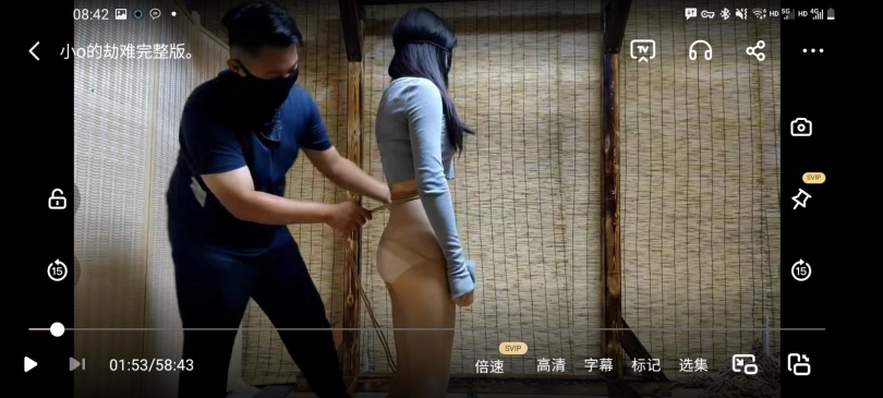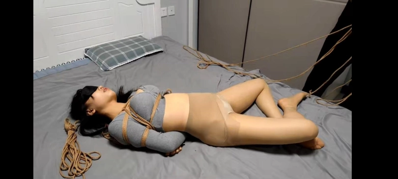 小o在练习气功时被乘机而入的坏人点住穴道,把她绑成前手并缚,让她挣扎,但是小o没有挣扎开,于是又把她的腿摆成二郎腿姿势绑起来,如果她能挣扎开的话就放了她,结果挣扎很长时间也无济于事,最后把她带回家里,绑成团缚,非常紧完全动弹不得,可怜得小o只能卖力挣扎。