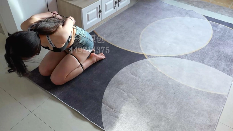 妹子双膝跪地,用扎带绑住大腿和小腿。