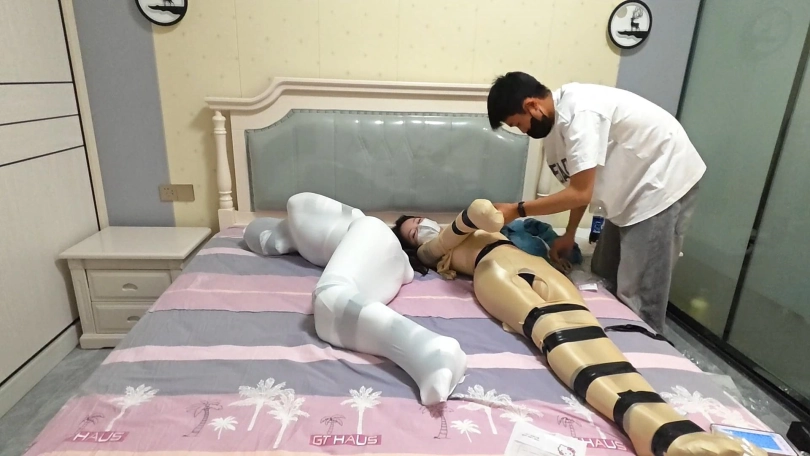 6.上下两条全包白丝将模特包进去,然后放置挣扎五分钟后,将两个模特背对背用胶带缠几圈眼睛,嘴巴,胸上下,腰部,屁股,大腿,小腿,脚踝。(另一个就是把白色换成肉色,胶带统一为黑色或者红色)
