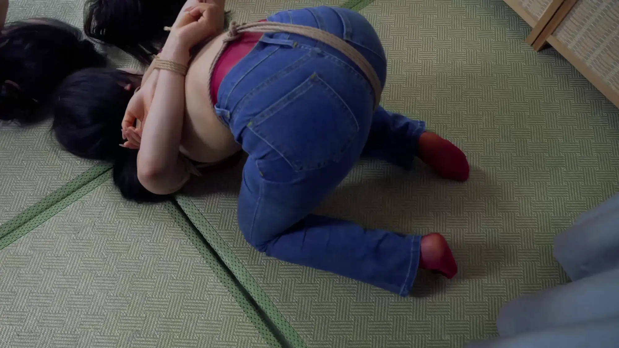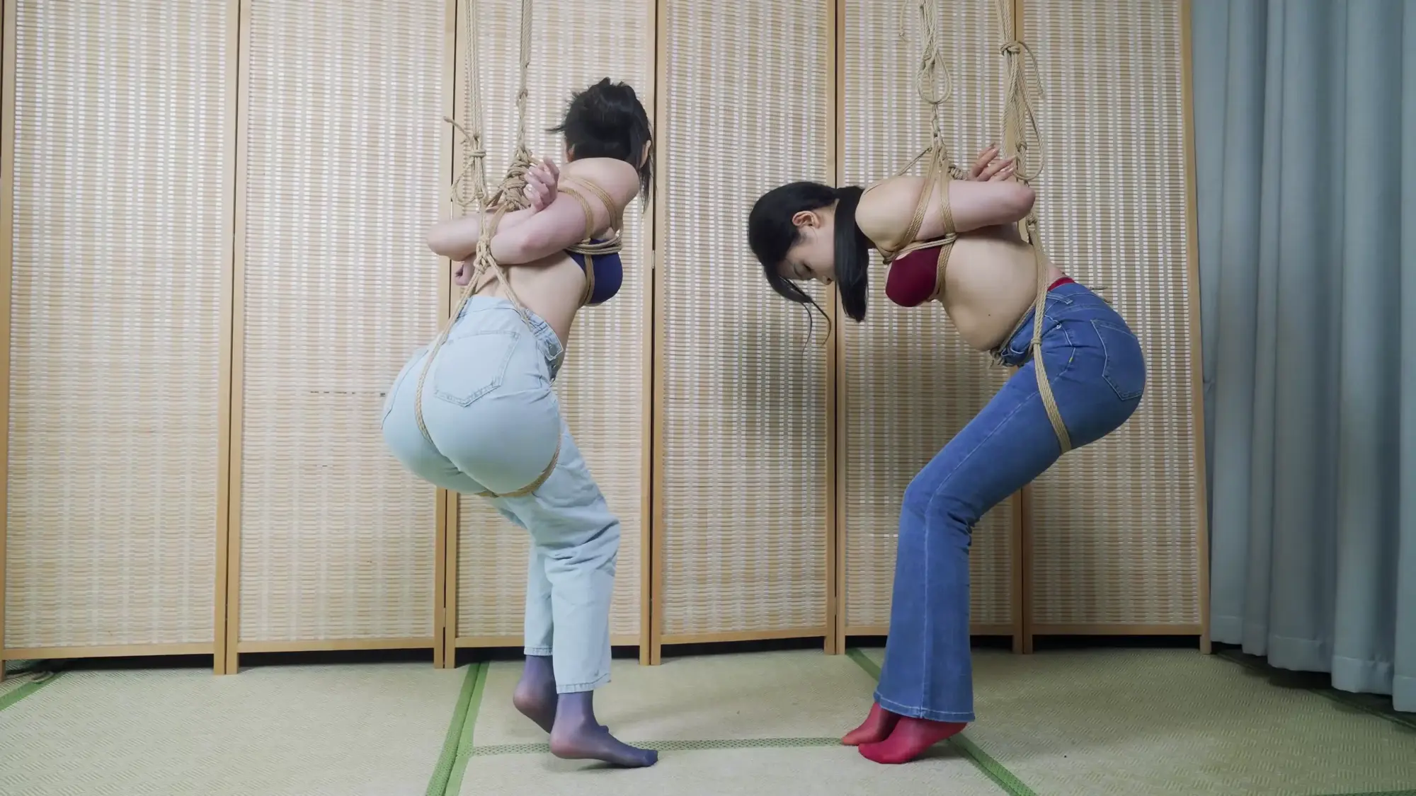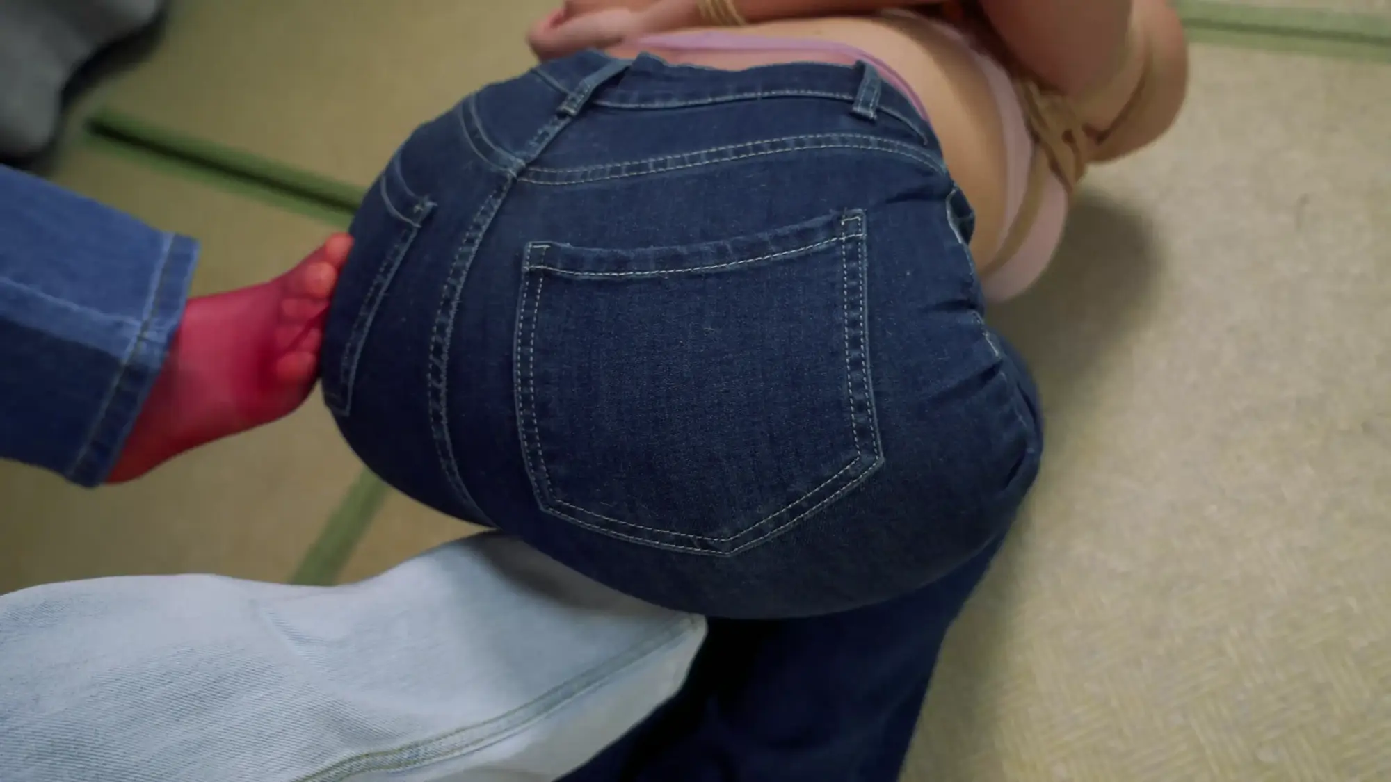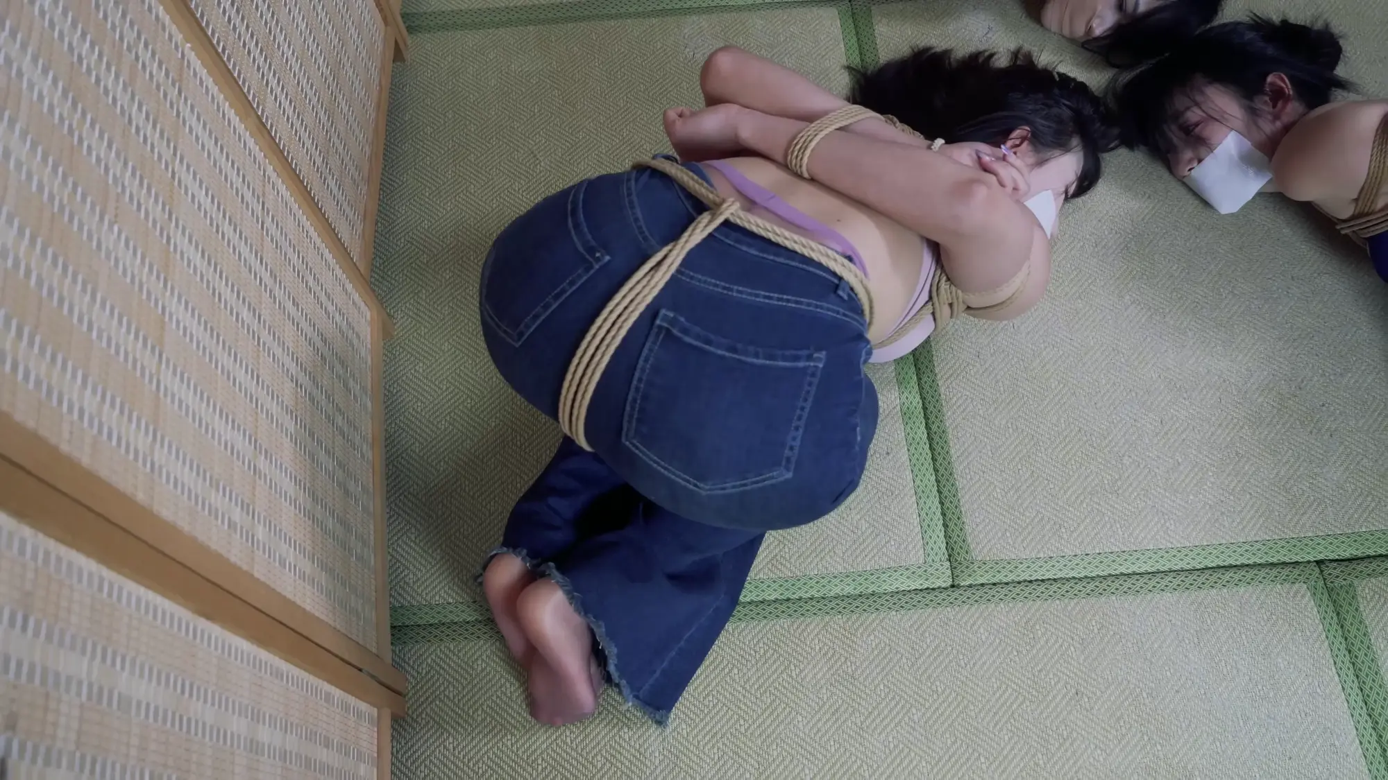 第三环:牛仔裤这么显臀,当然要让她们三个撅着屁股好好玩弄一番,拉扯股绳、SP、震动棒、挠痒,圆滚滚的屁股真好玩;