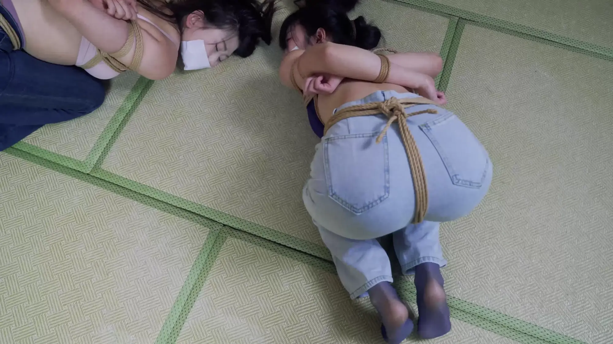 第二环:趁着花花不注意也把她强制捆绑起来,让嗷嗷小0用脚狠狠踹花花的屁股报仇;