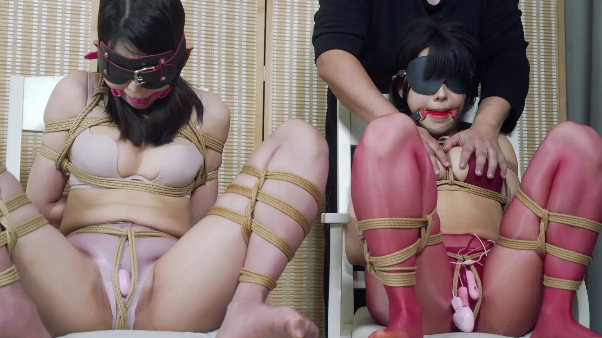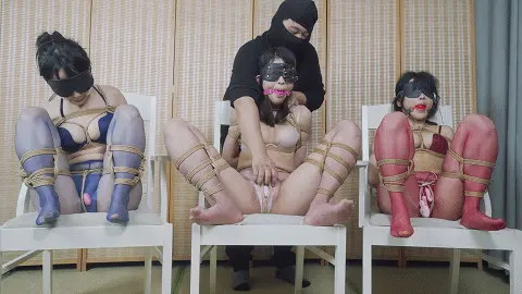 第八环:没有胜利者,花花嗷嗷小0都被M字开腿紧缚,戴上口球塞入跳蛋并放置在椅子上,客户揉捏三人的胸部,拉扯股绳,还恶趣味的用皮鞭抽打三人的隐私处~